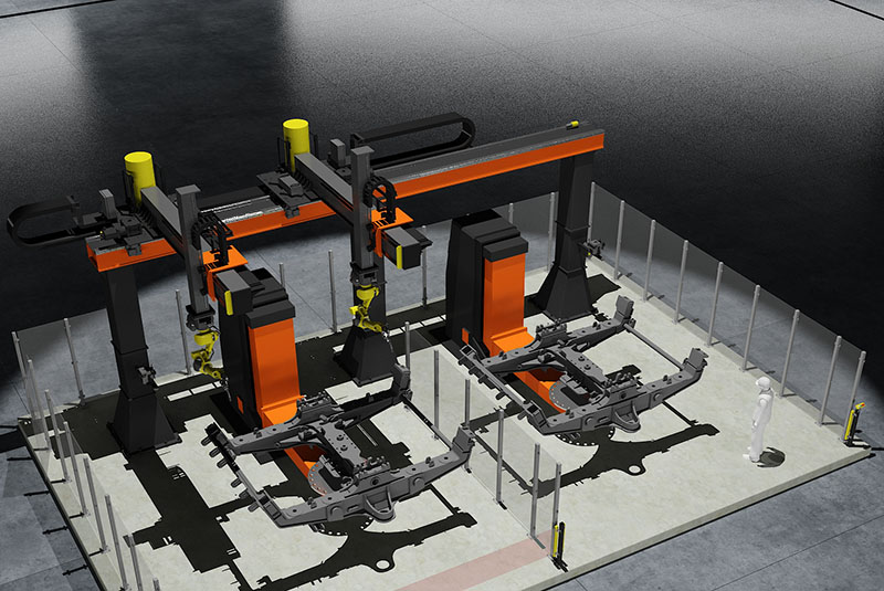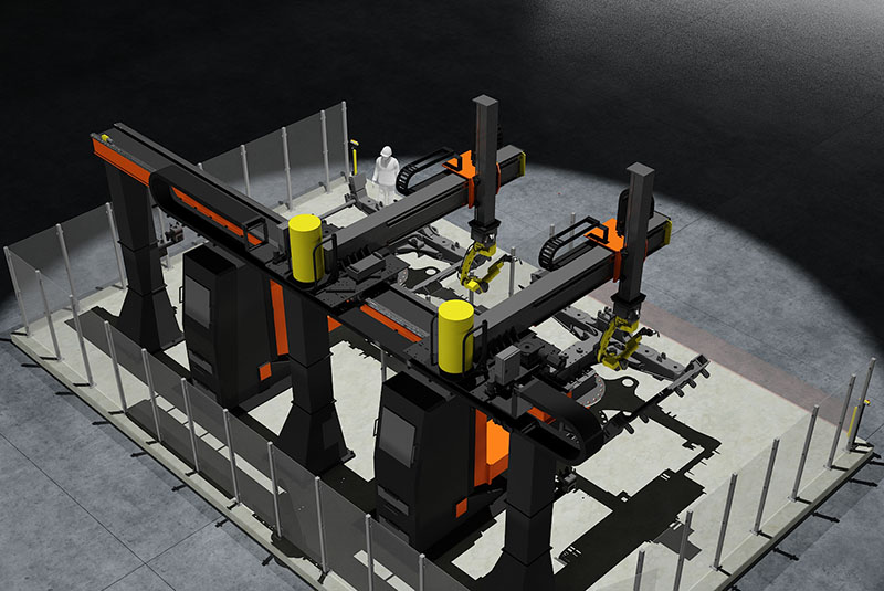 · Kiekvienas robotas yra įrengtas ant konsolinio triašio portalo, praplėčiančio jų pasiekiamumo zoną linijine, skersine ir vertikalia kryptimis;