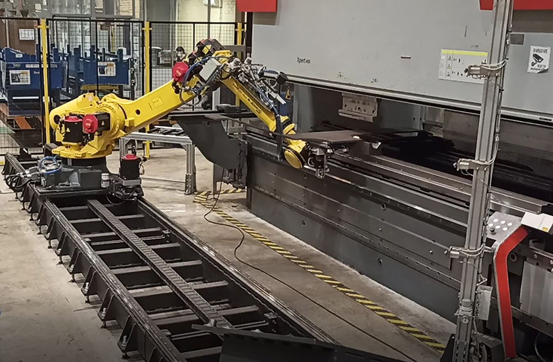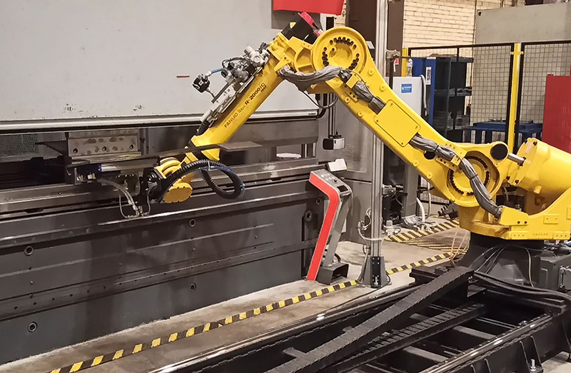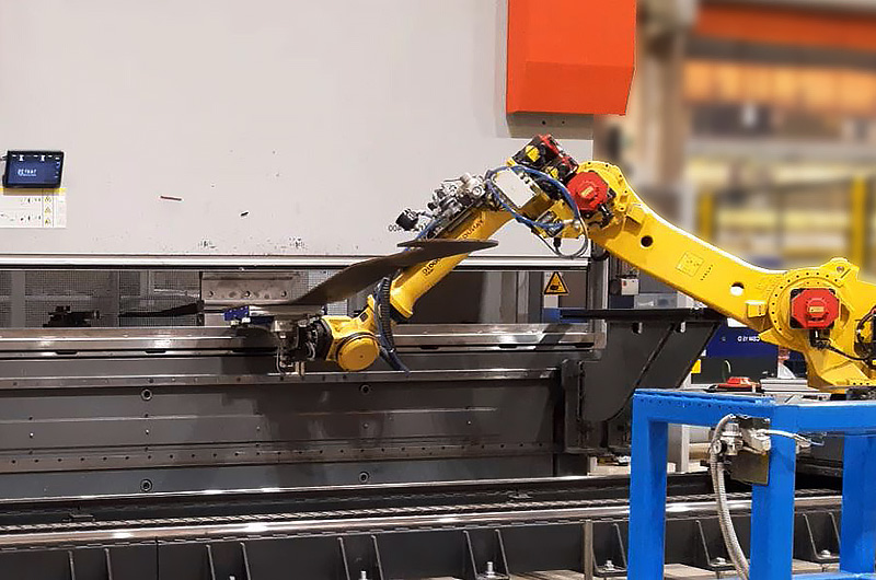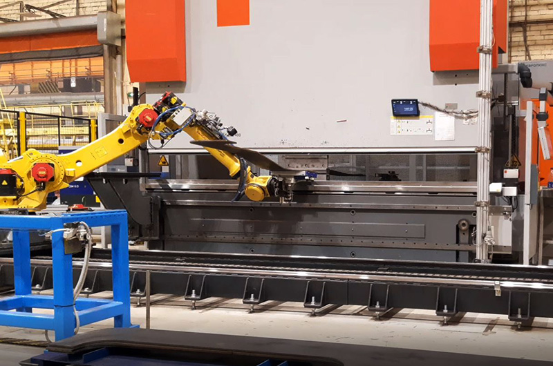 Robotizuoto komplekso sudėtyje esantis pramoninis robotas atlieka automatinį gaminių lenkimą užtikrinant sinchroninį darbą su lakštų lankstymo staklėmis.