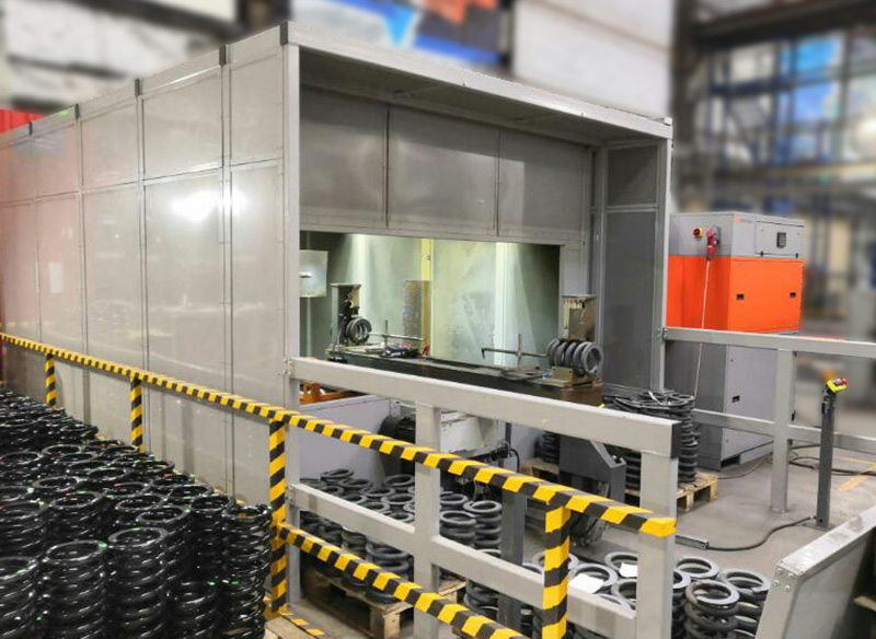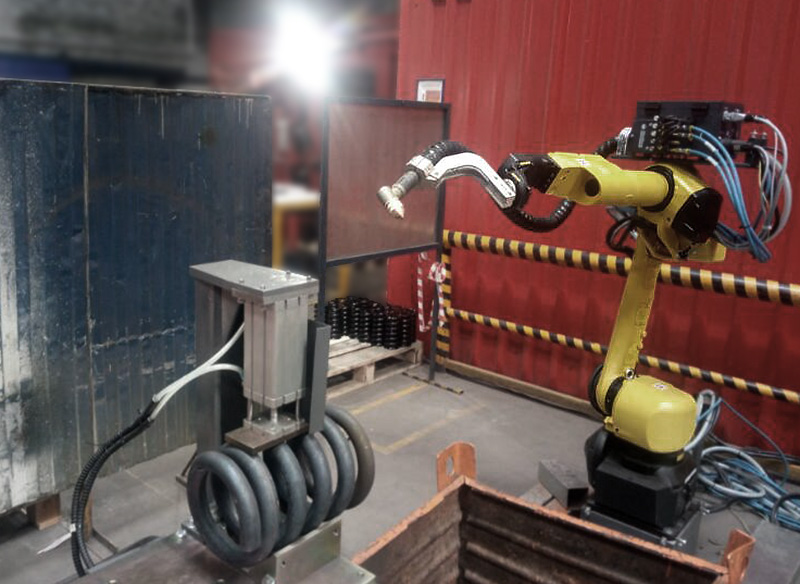Robotizuoto komplekso sudėtyje esantis pramoninis robotas užtikrina spyruoklių galų pjovimą pilnai automatiniame režime.