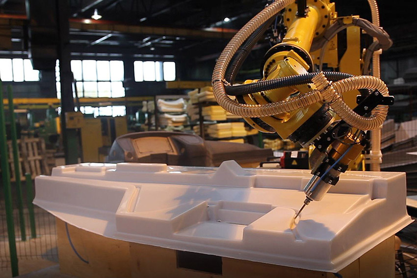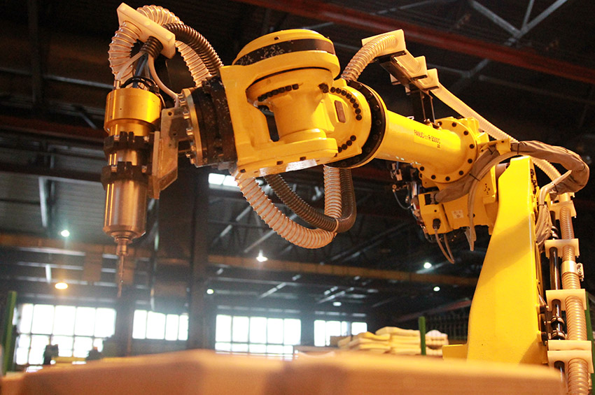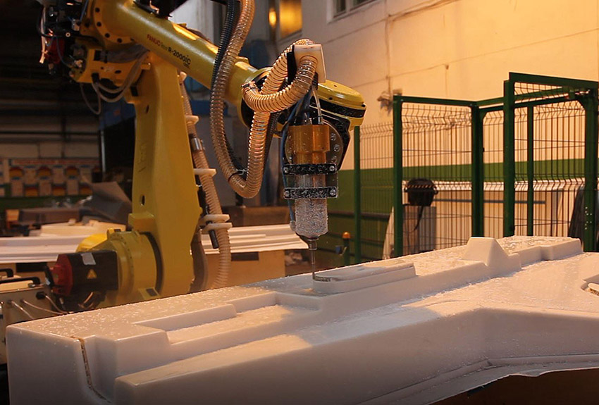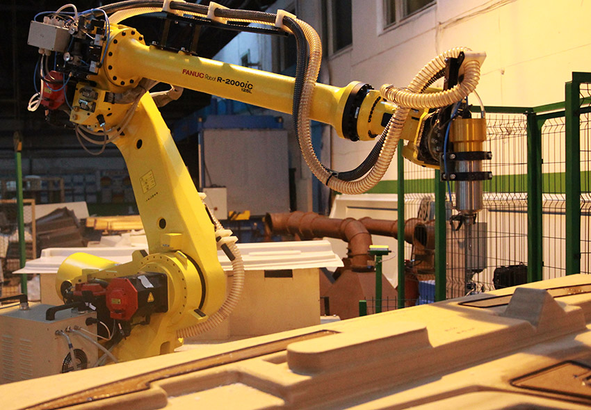 Robotizuoto komplekso sudėtyje esantis pramoninis robotas užtikrina plastikinių skydų frezavimą ir pjaustymą pilnai automatiniame režime.