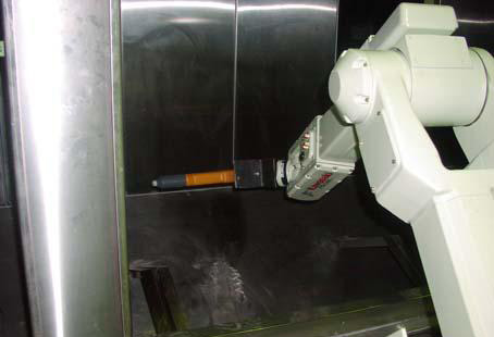 Dažomiems gaminiams nuolat judant kiaurymės tipo konvejeriu, kertančiu dažymo kamerą, robotas automatiškai užpurškia dangą penkiose radiatoriaus pusėse.